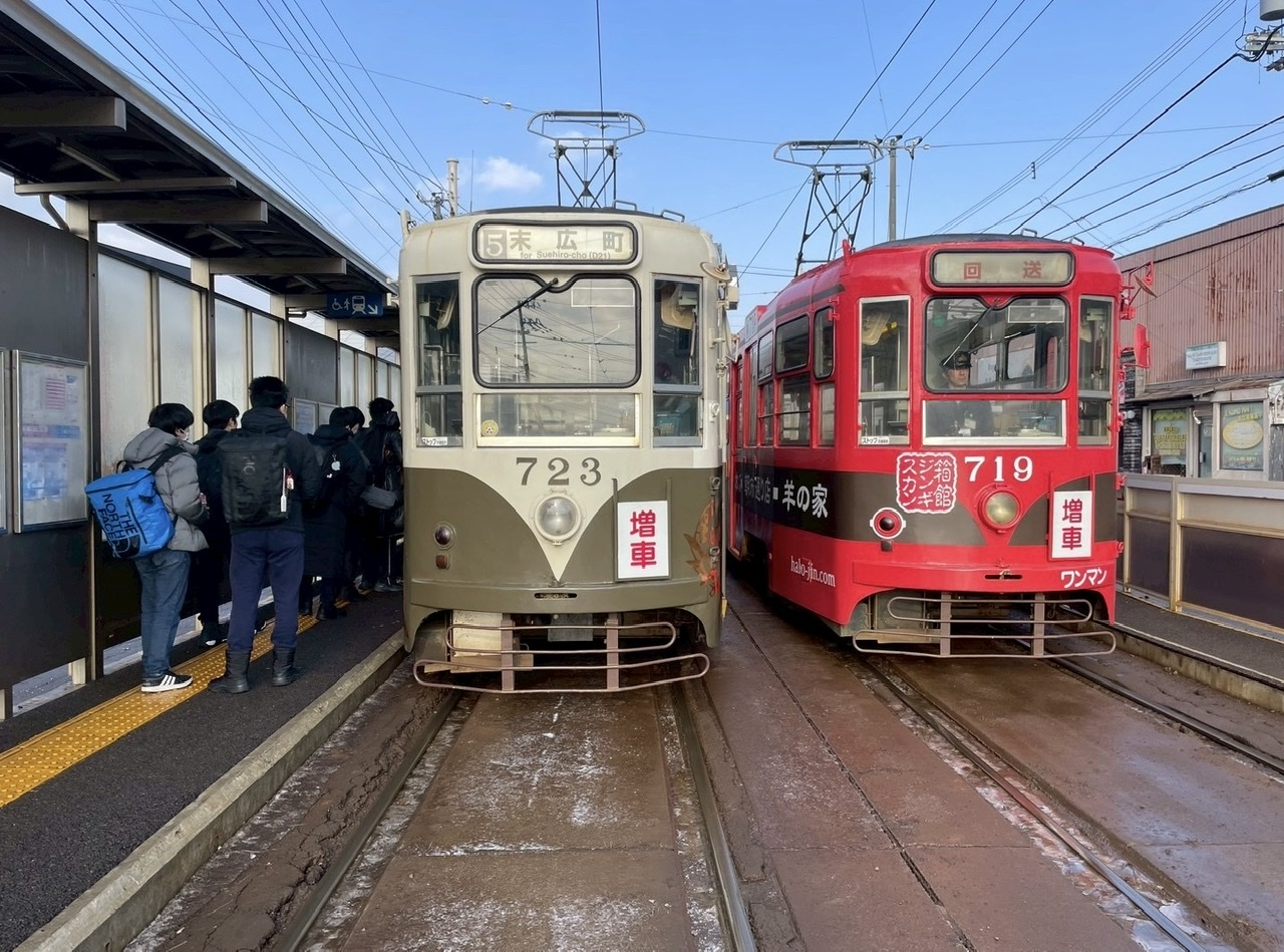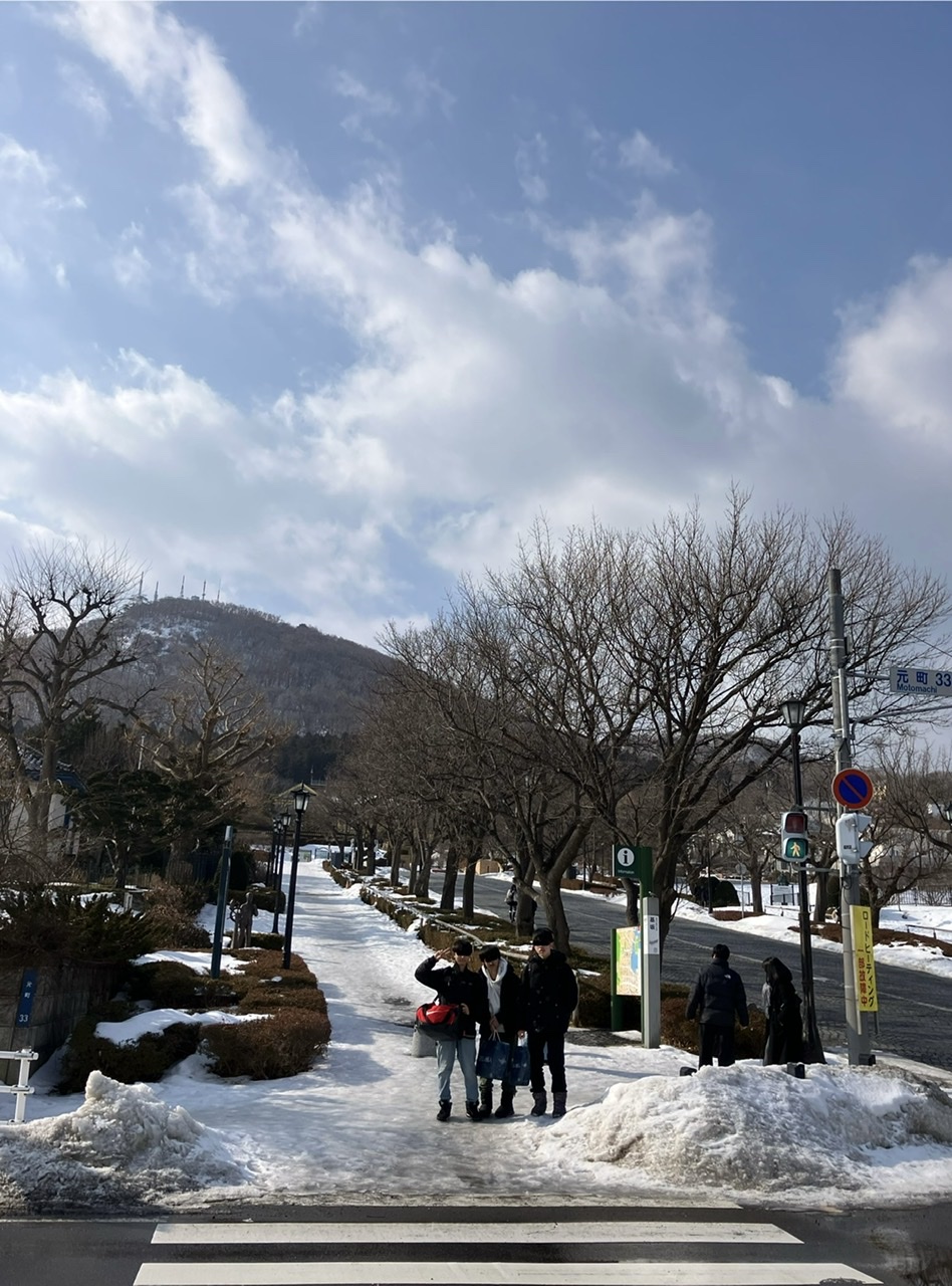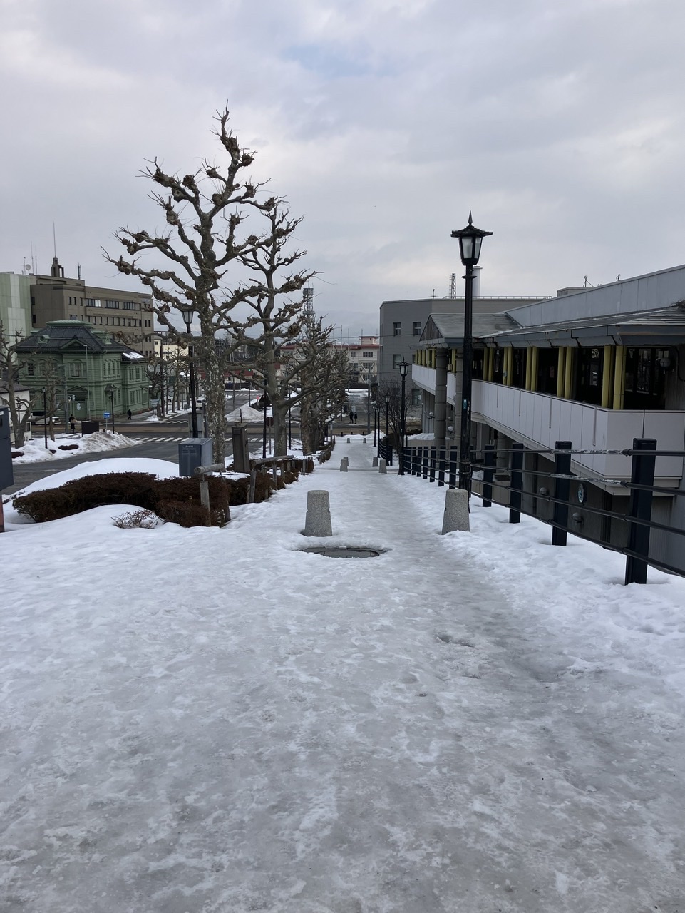 函館自由行動の様子です。天気は良く、気温も5℃前後と寒くはないですが、路面は凍結している場所が多いです。足元に気をつけながら、修学旅行最後の観光を楽しんでいます。