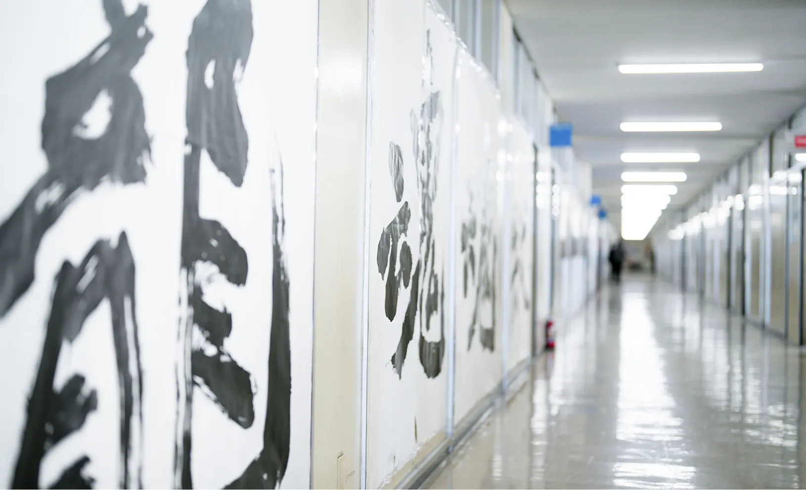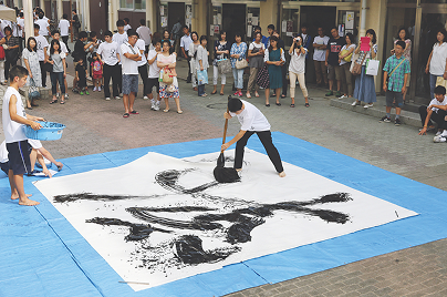 畳の書道室で活動しています。重さ3kgの巨大筆による発表から仮名や写経まで、自由に落ち着いた空間の中、書作品を制作しています。