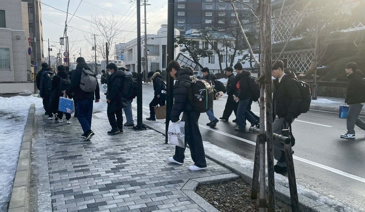 函館自由行動の様子です。天気は良く、気温も5℃前後と寒くはないですが、路面は凍結している場所が多いです。足元に気をつけながら、修学旅行最後の観光を楽しんでいます。